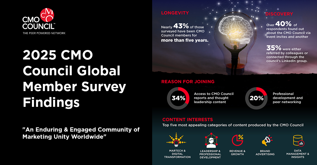 The 2025 CMO Council Global Member Survey highlights a strong and lasting sense of community, with many members staying engaged for over five years. Most discovered the Council through events or peer referrals, and the top draw remains its trusted thought leadership. Professional development and networking continue to add meaningful value for a broad segment of the membership.